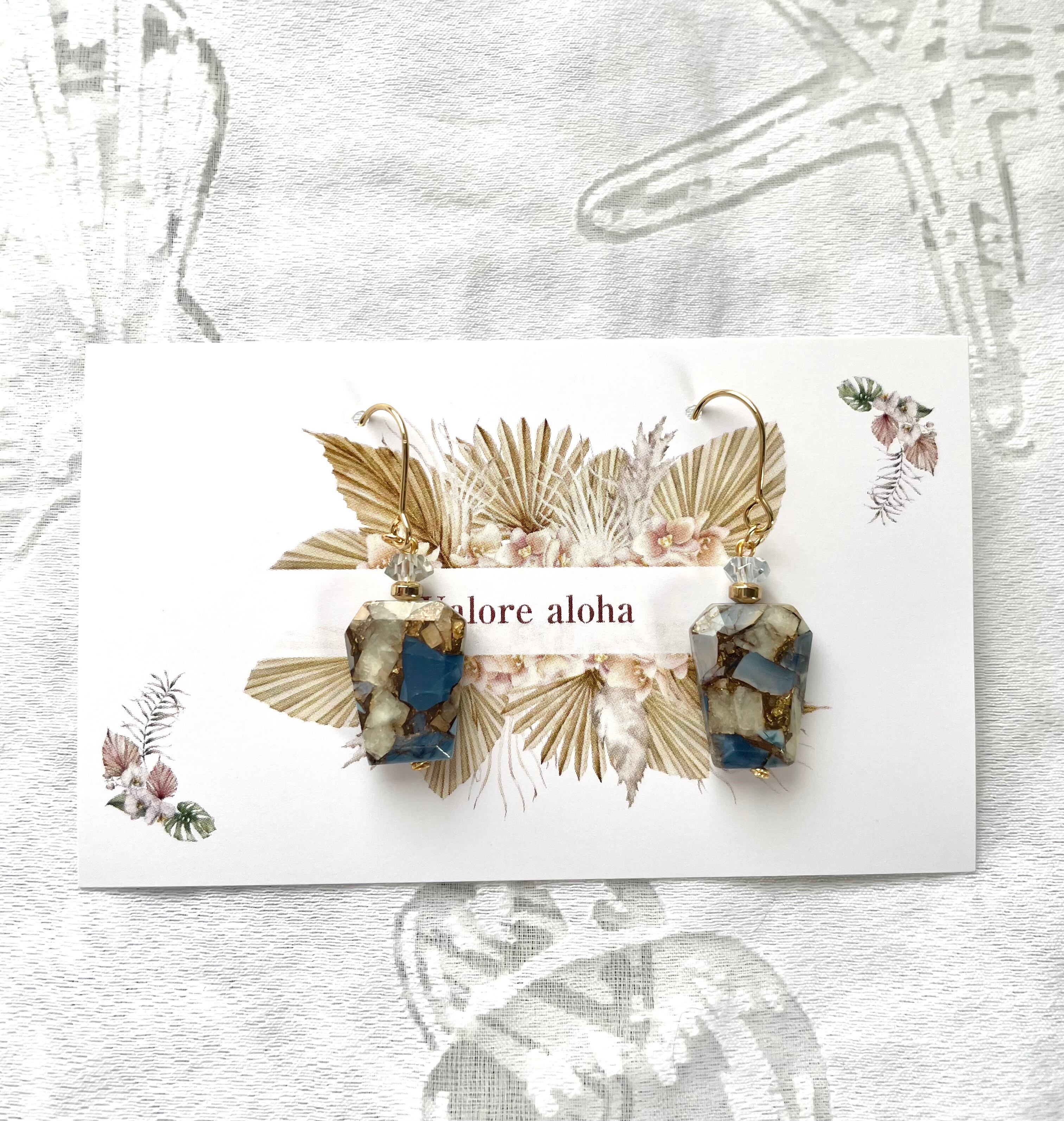 香水瓶の形をしたピアスにボタンカットのアクアマリンを組み合わせました。
