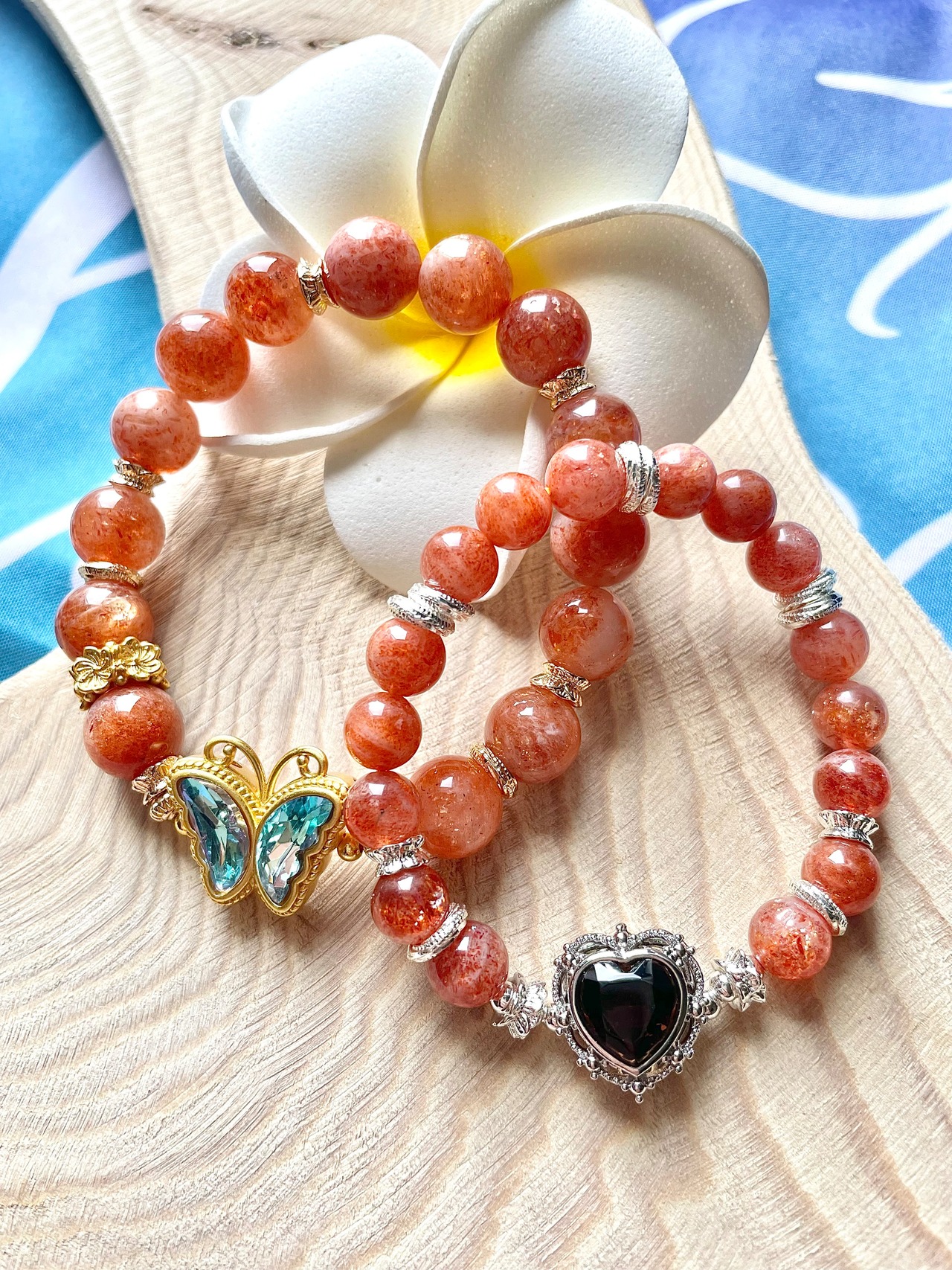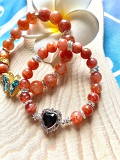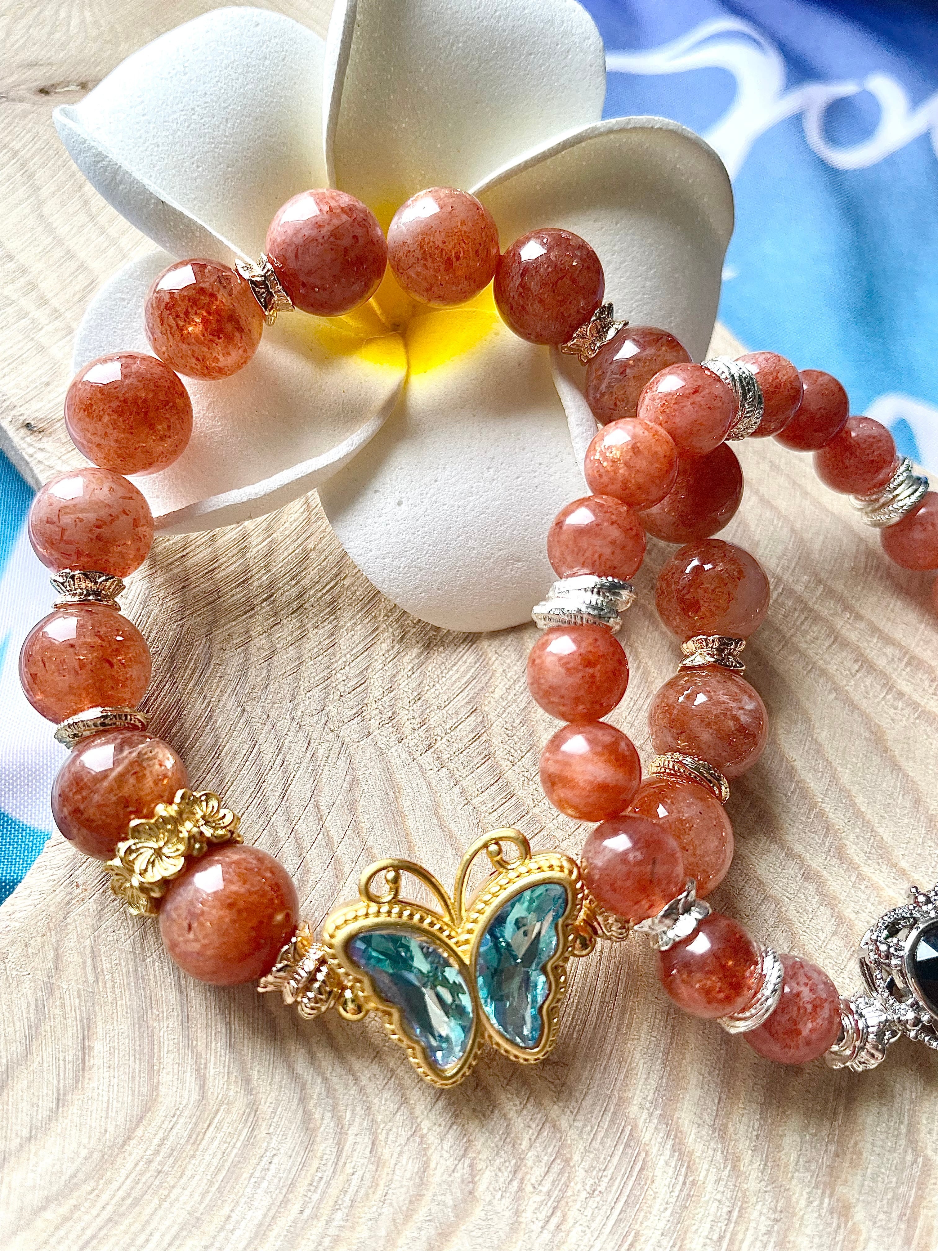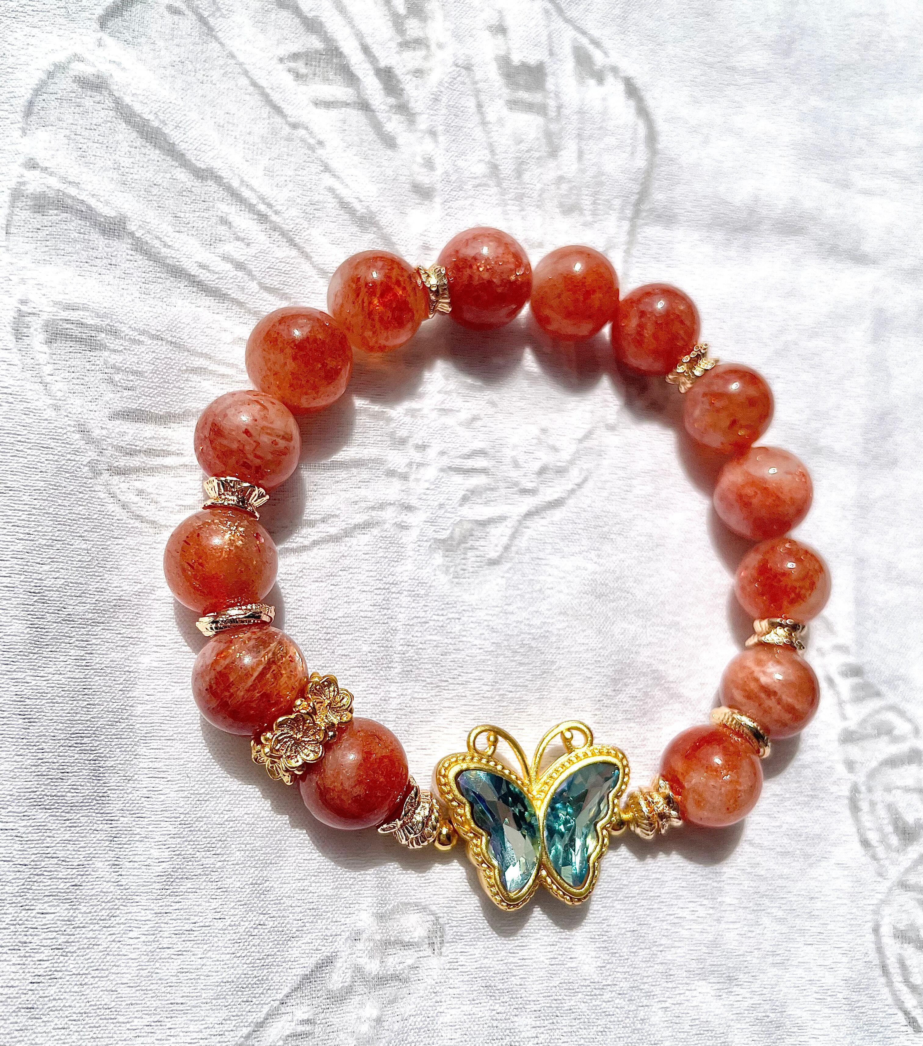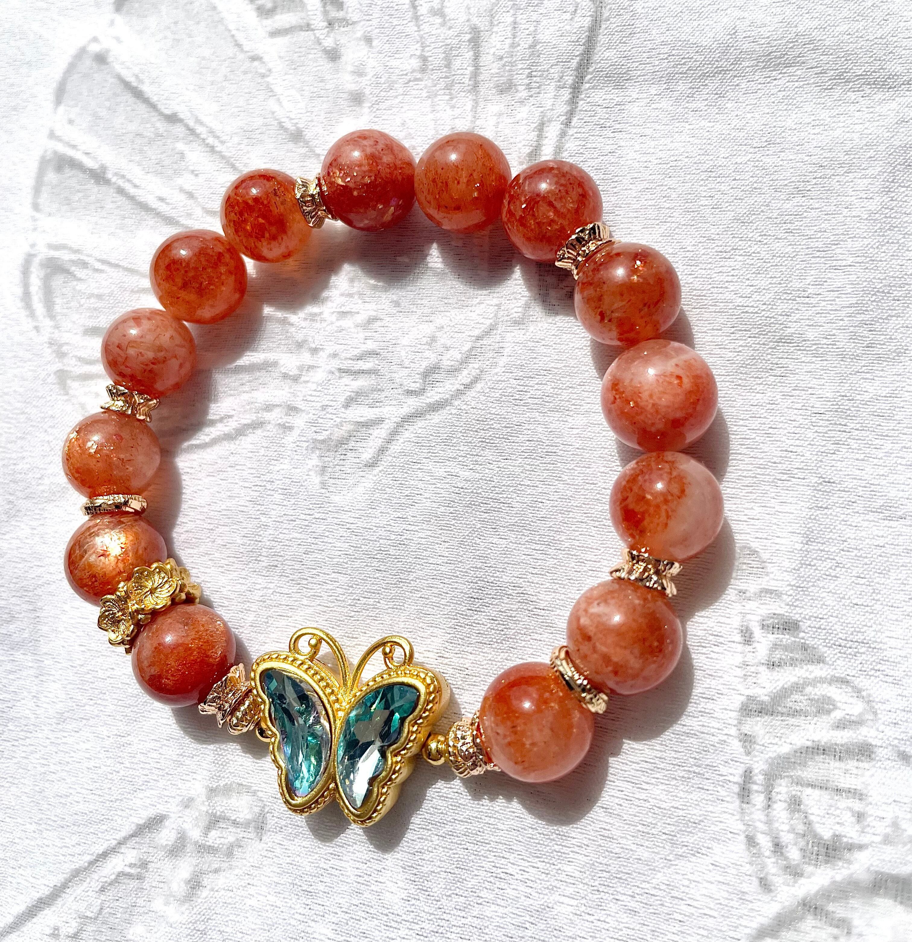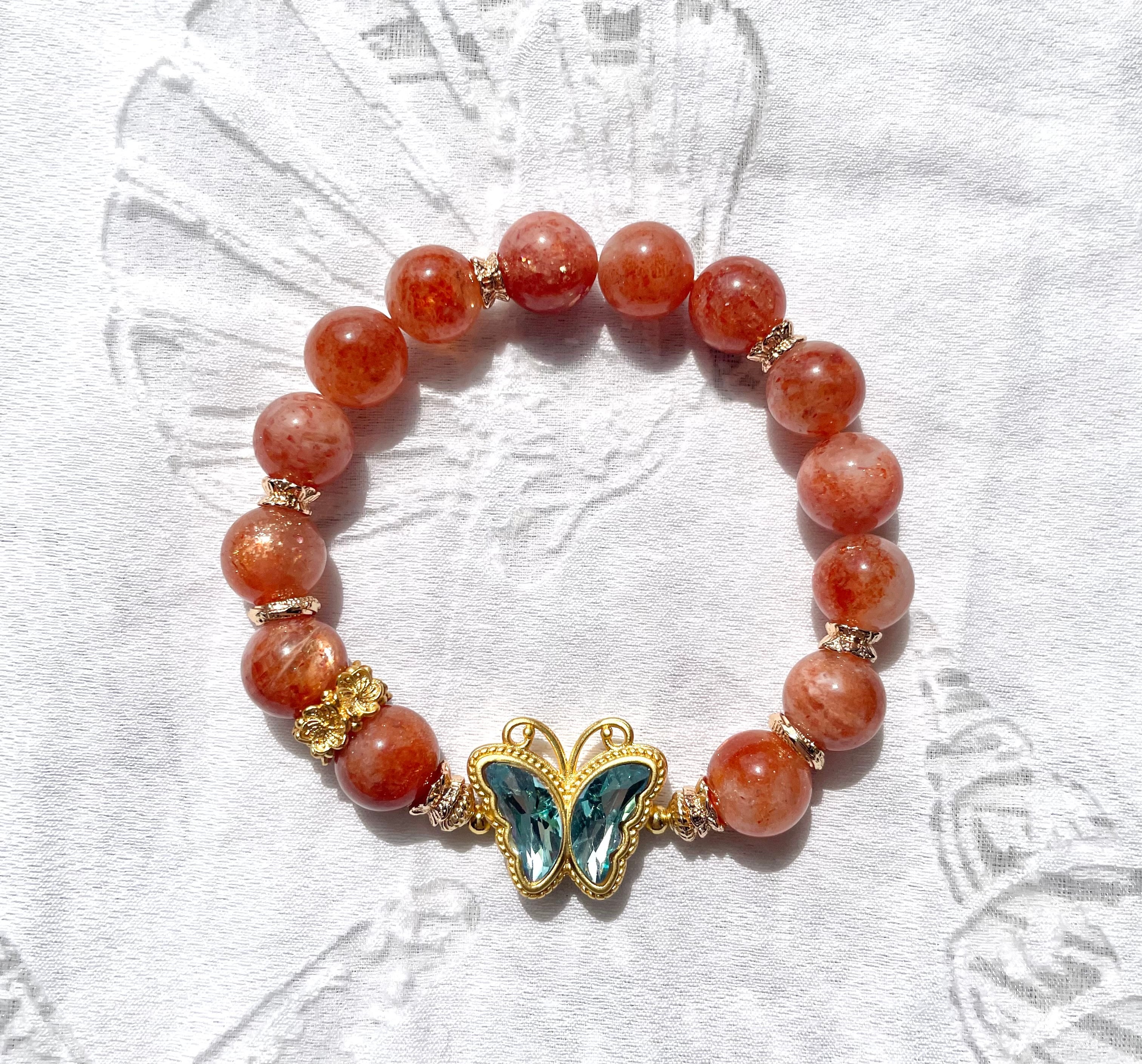 天然石 オレンジサンストーンと蝶々ブレスレット