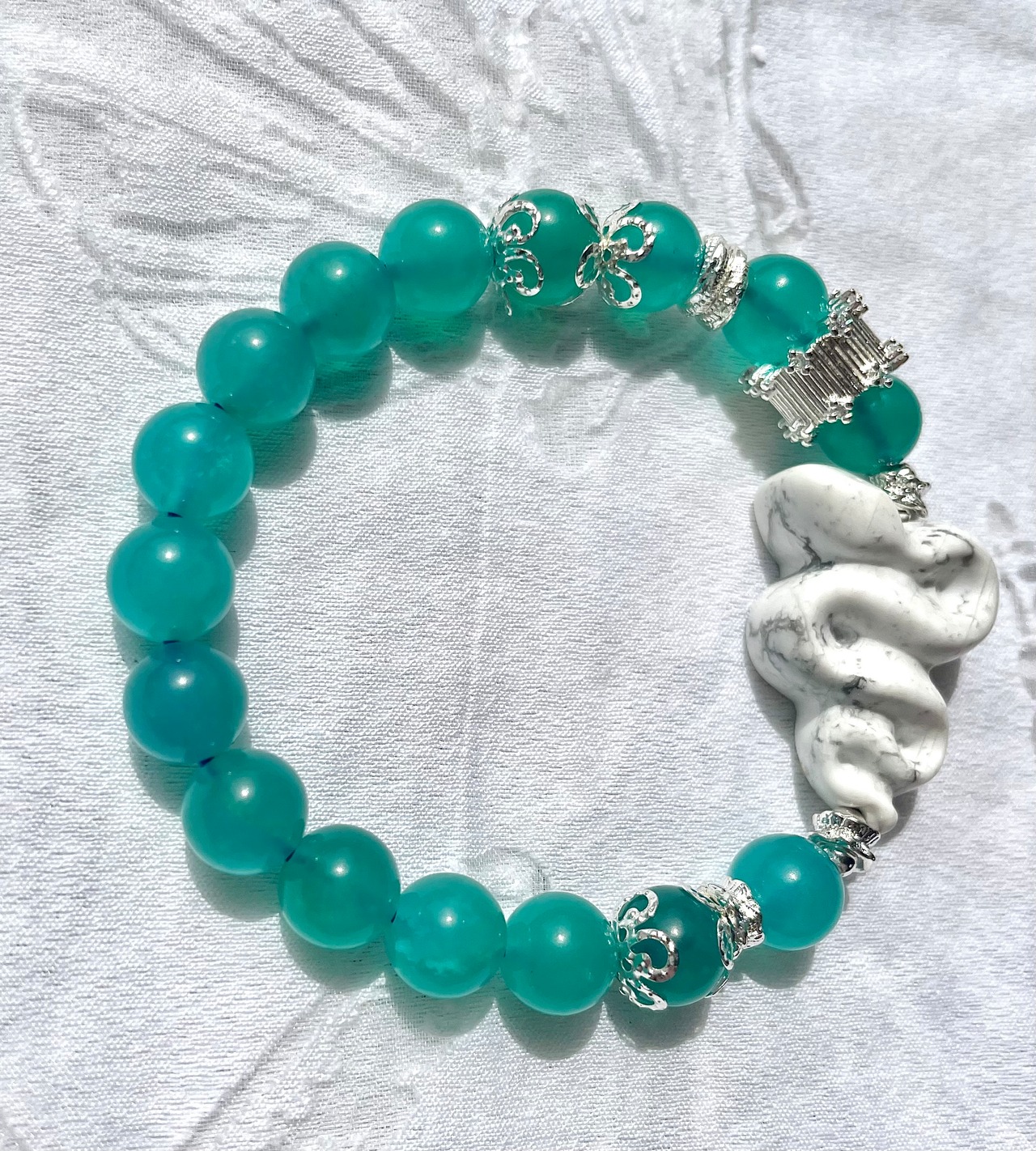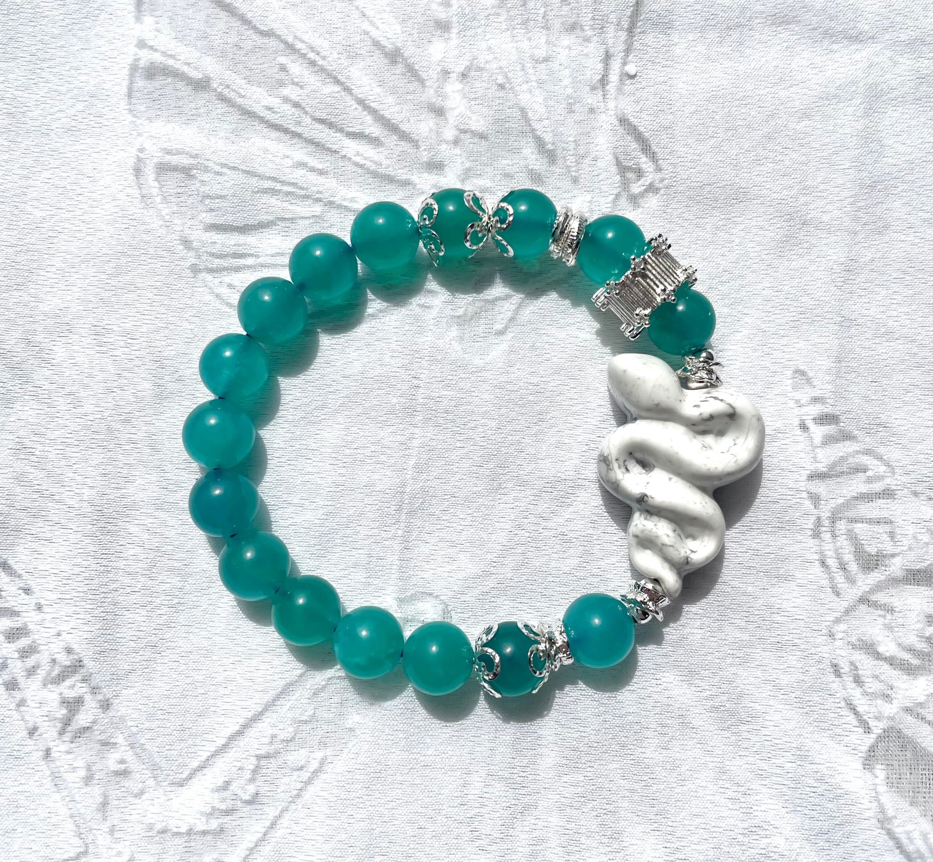 アイスアマゾナイトは、心を穏やかにし、ストレスを和らげるエネルギーがあるとされています。そして、ハウライト蛇は、自己表現を促し、感情のバランスを整える効果が期待できます。このブレスレットは、普段使いから特別なお出かけまで、あらゆるシーンに華やかさとアクセントを加えます。