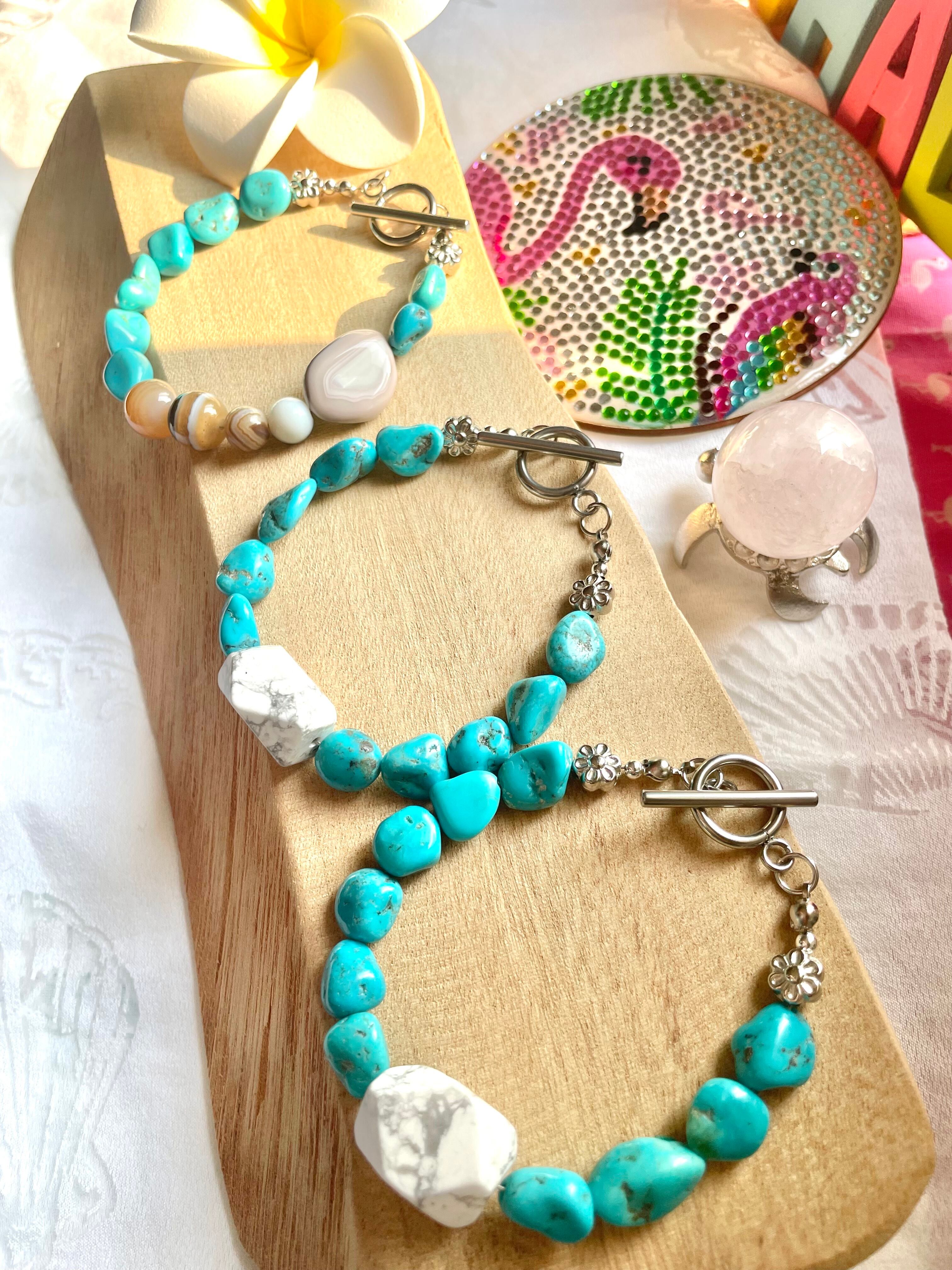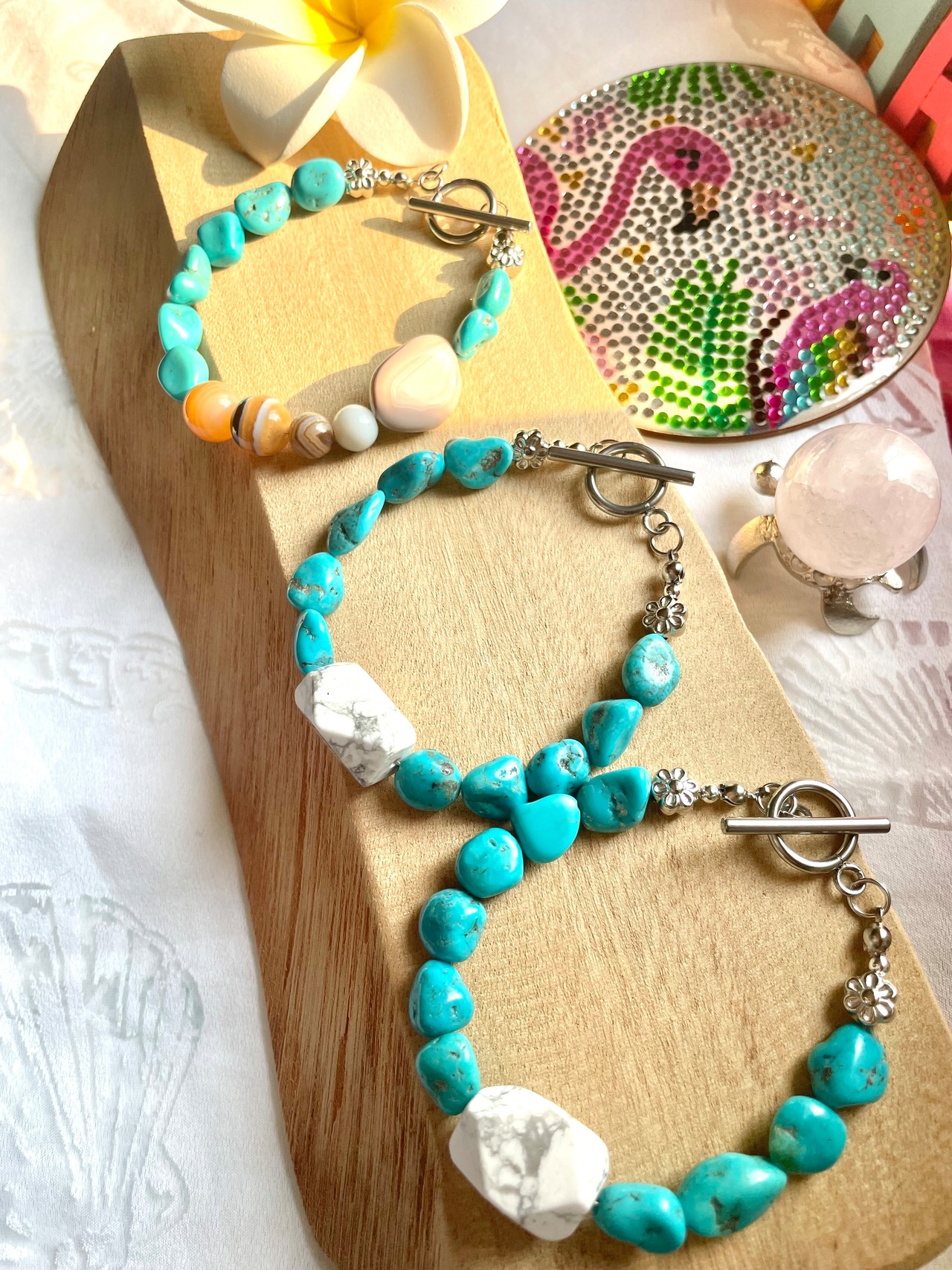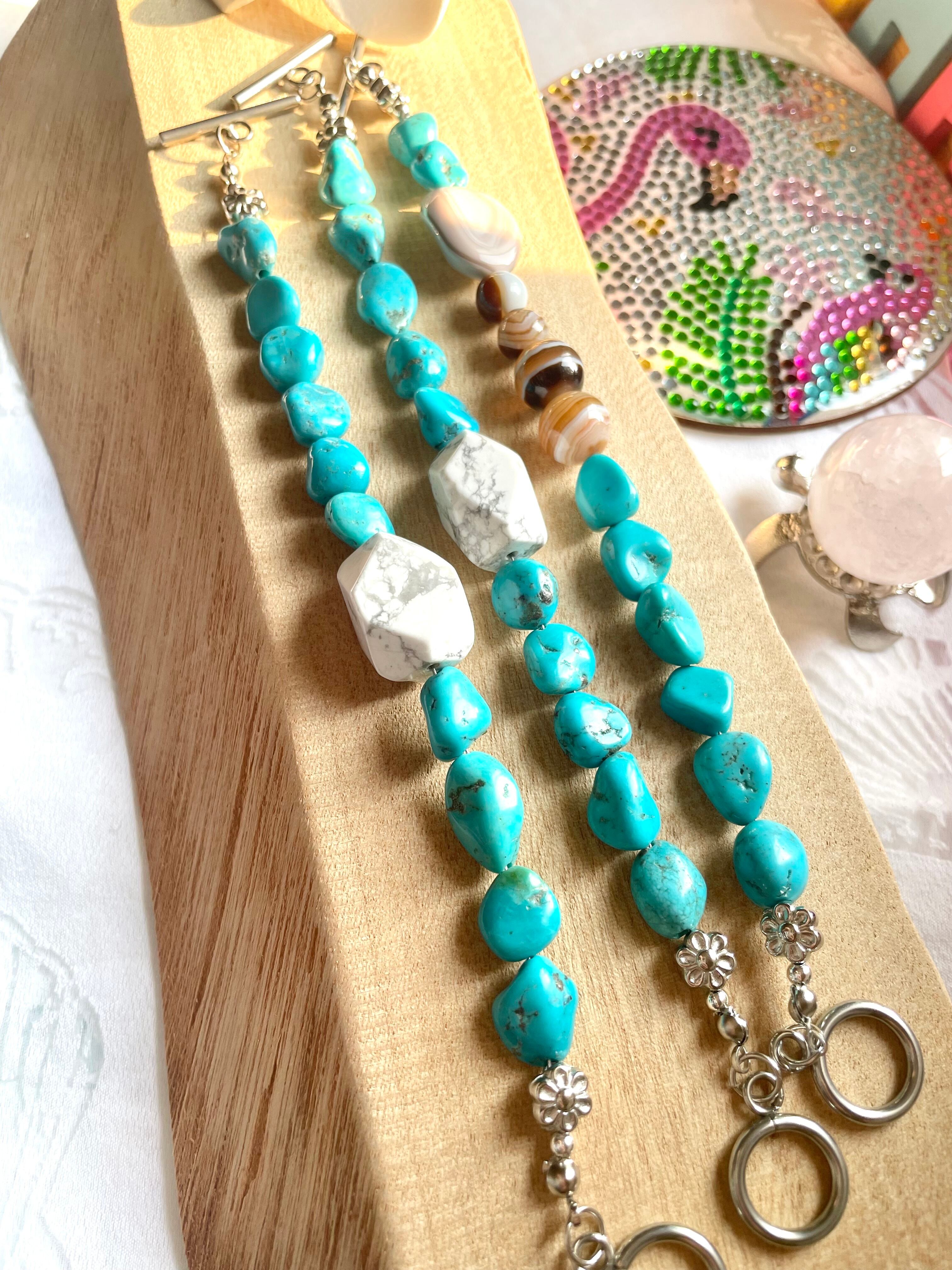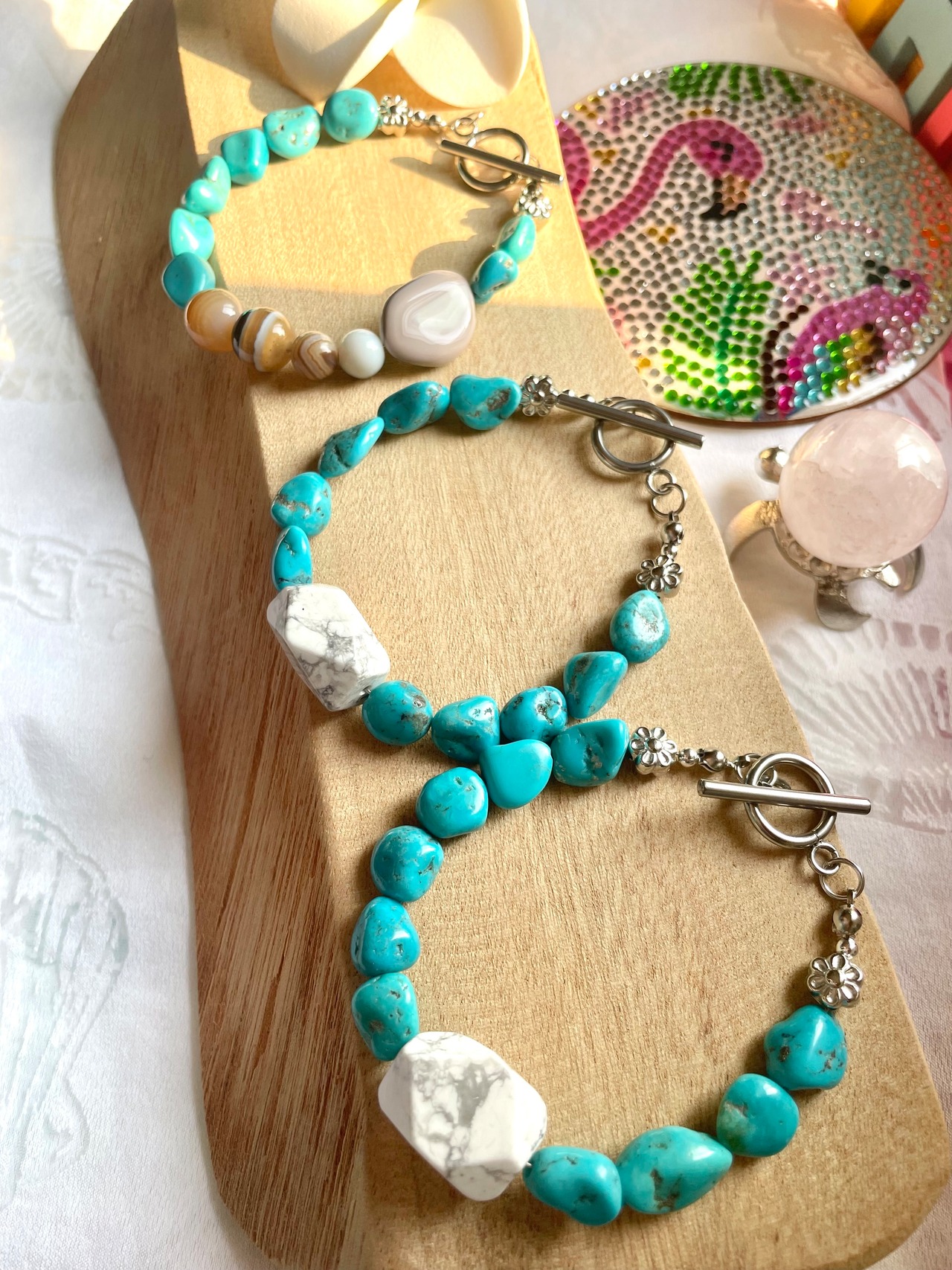 夏にピッタリなターコイズとハウライトのマンテルブレスレットは、鮮やかなターコイズブルーとホワイトの美しいコントラストが魅力のアイテムです