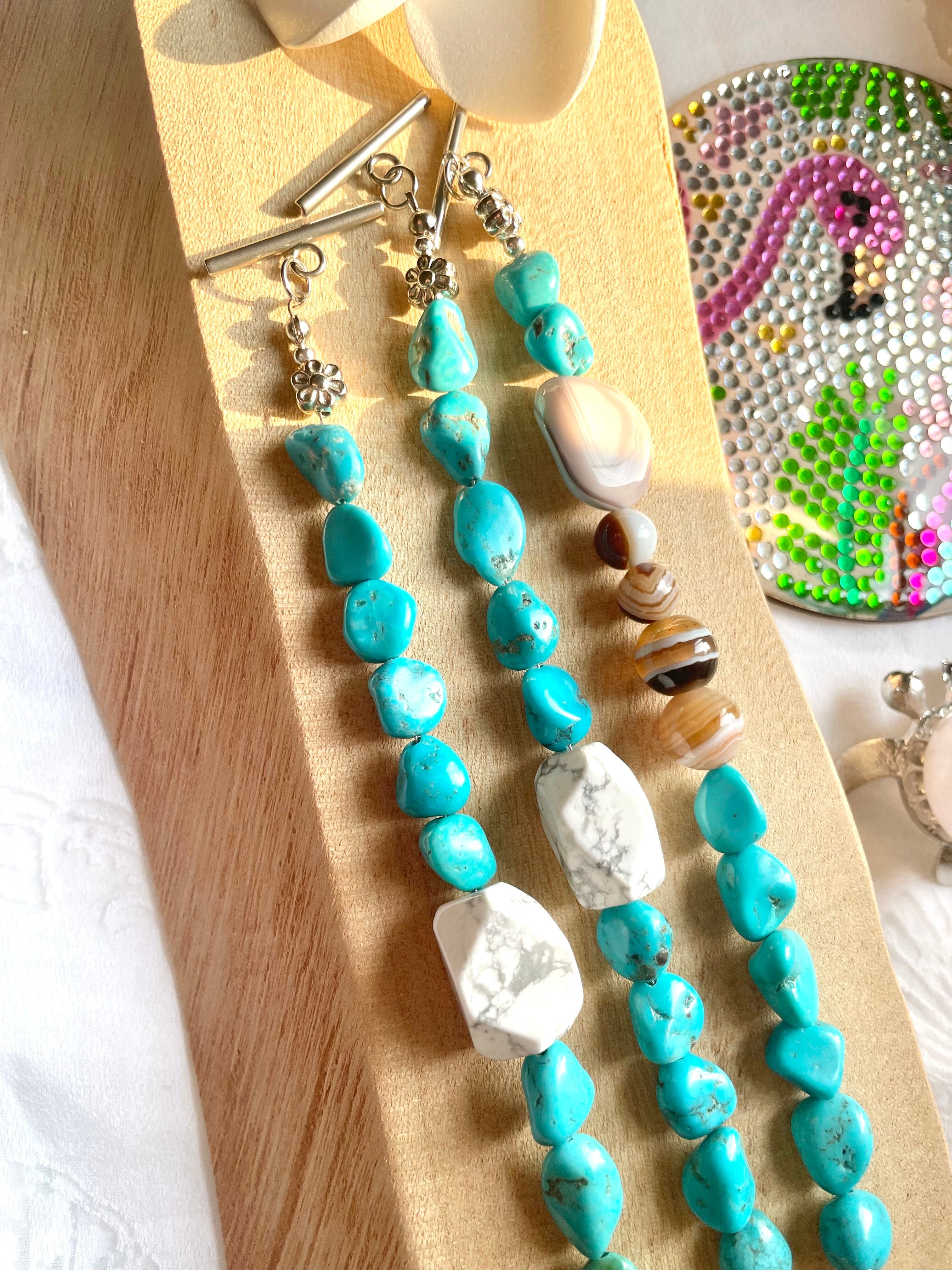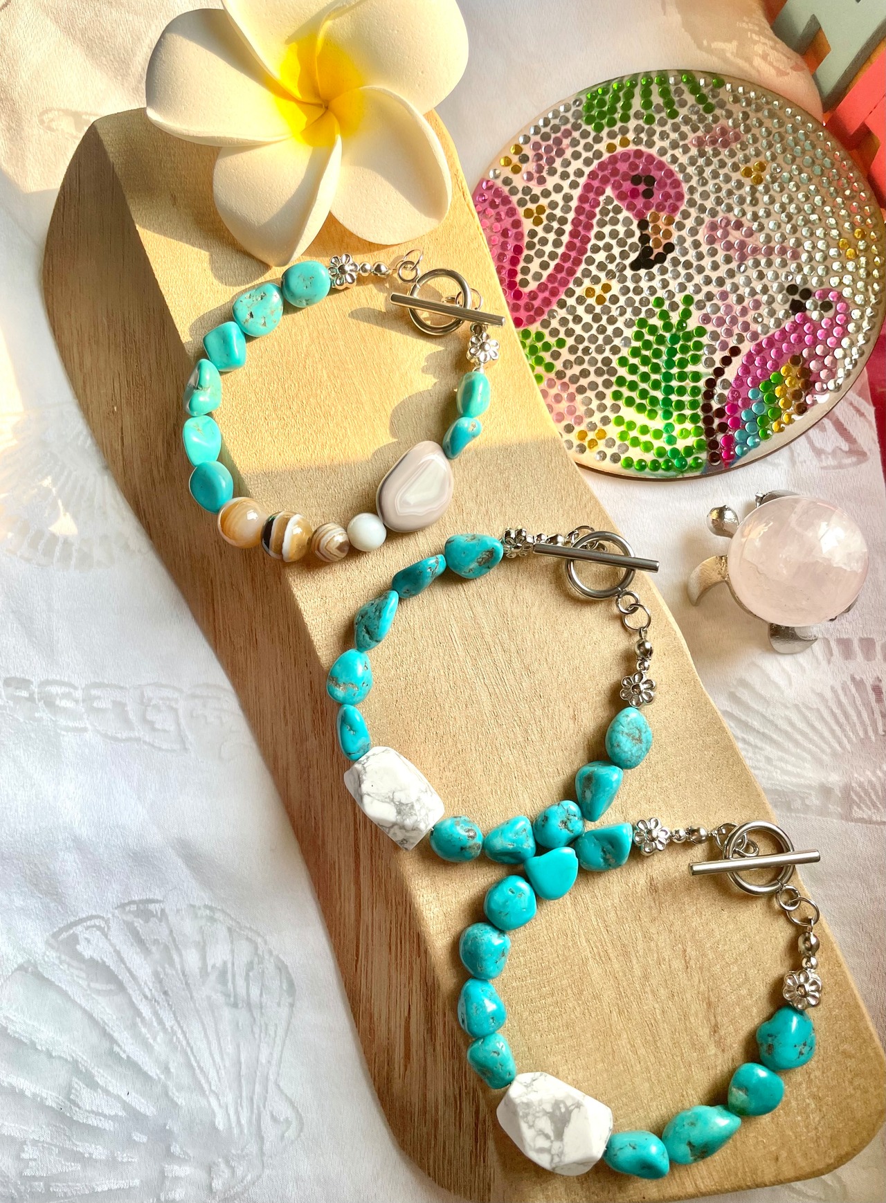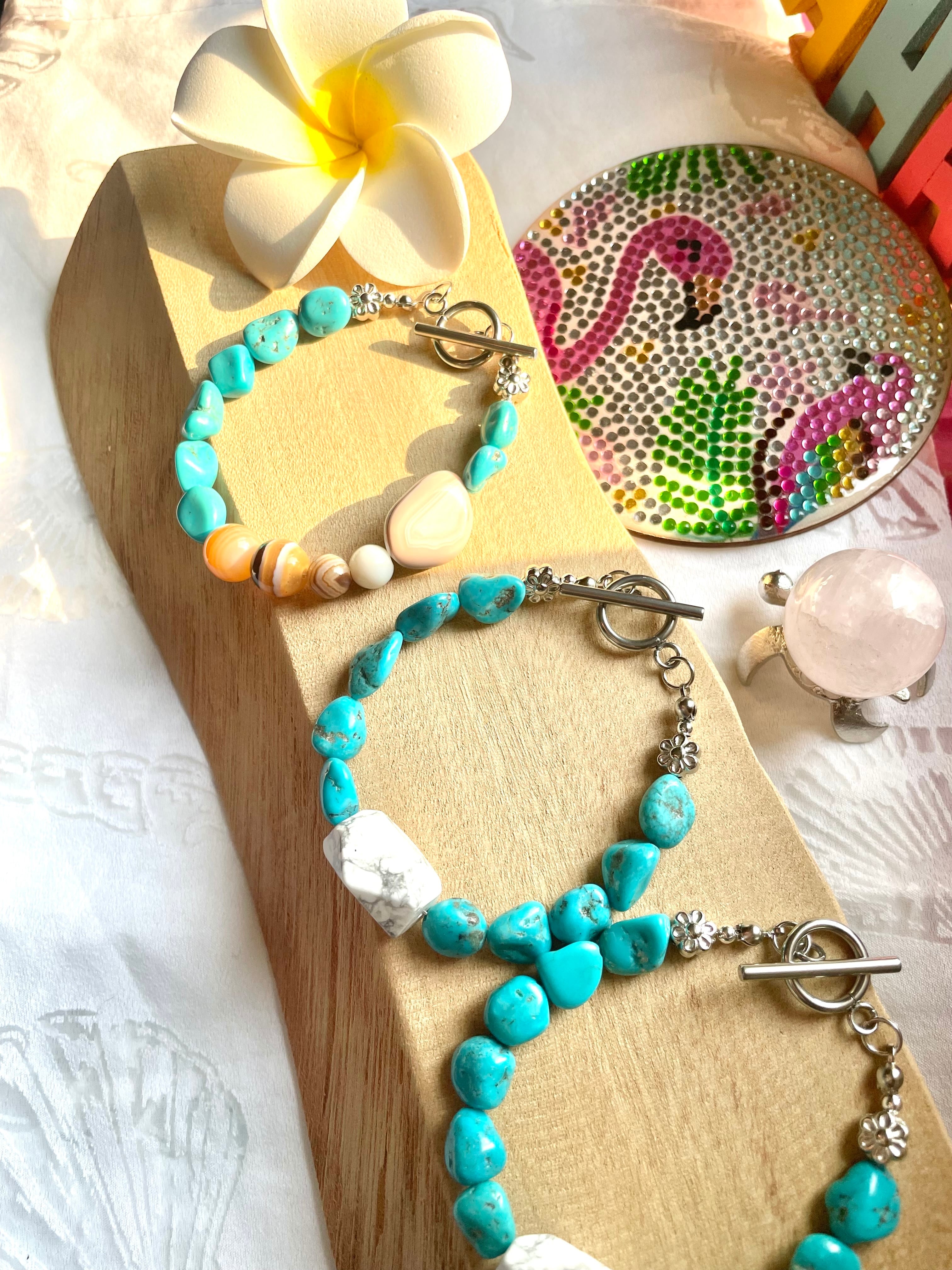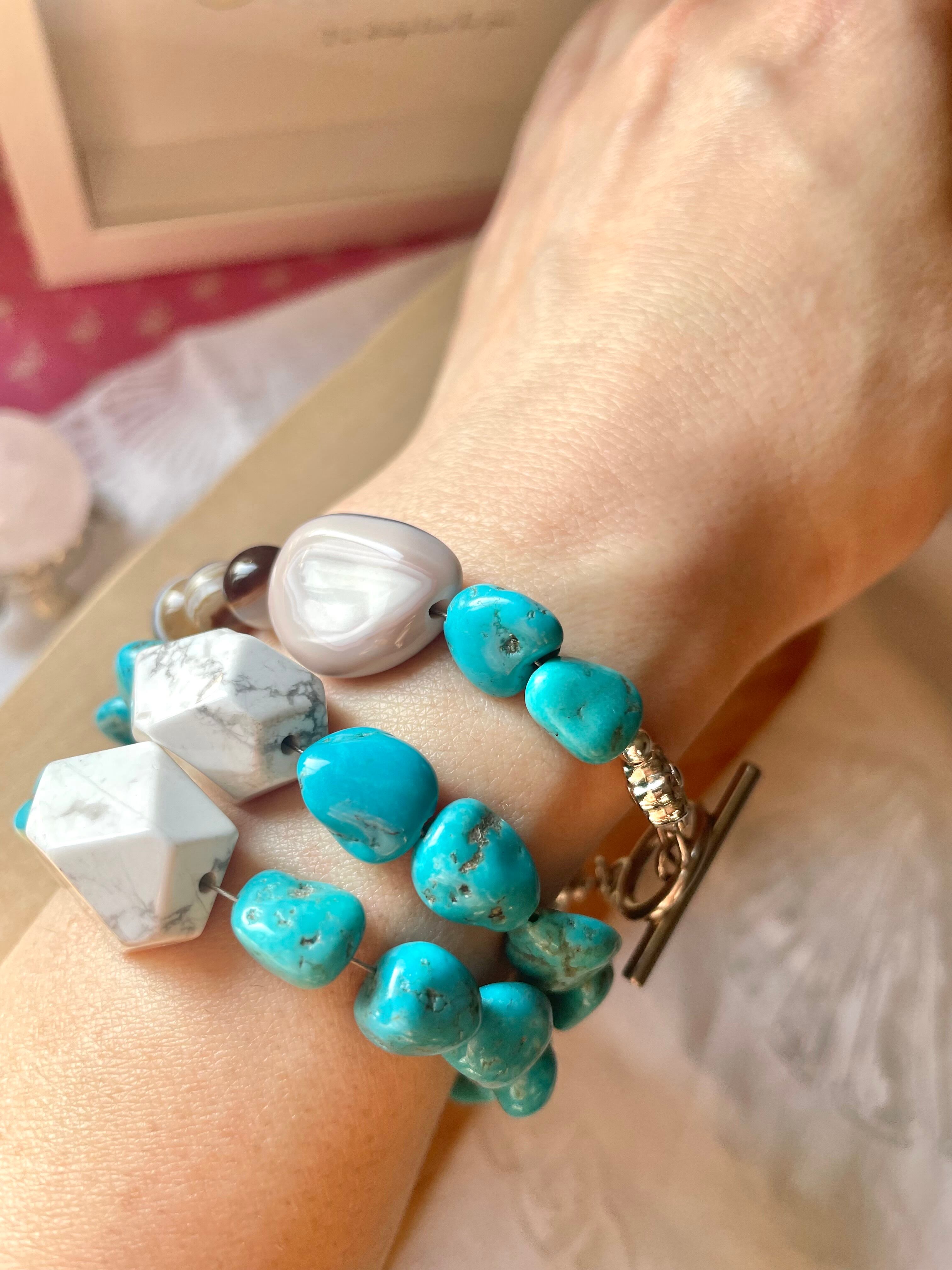夏にピッタリなターコイズとハウライトのマンテルブレスレットは、鮮やかなターコイズブルーとホワイトの美しいコントラストが魅力のアイテムです