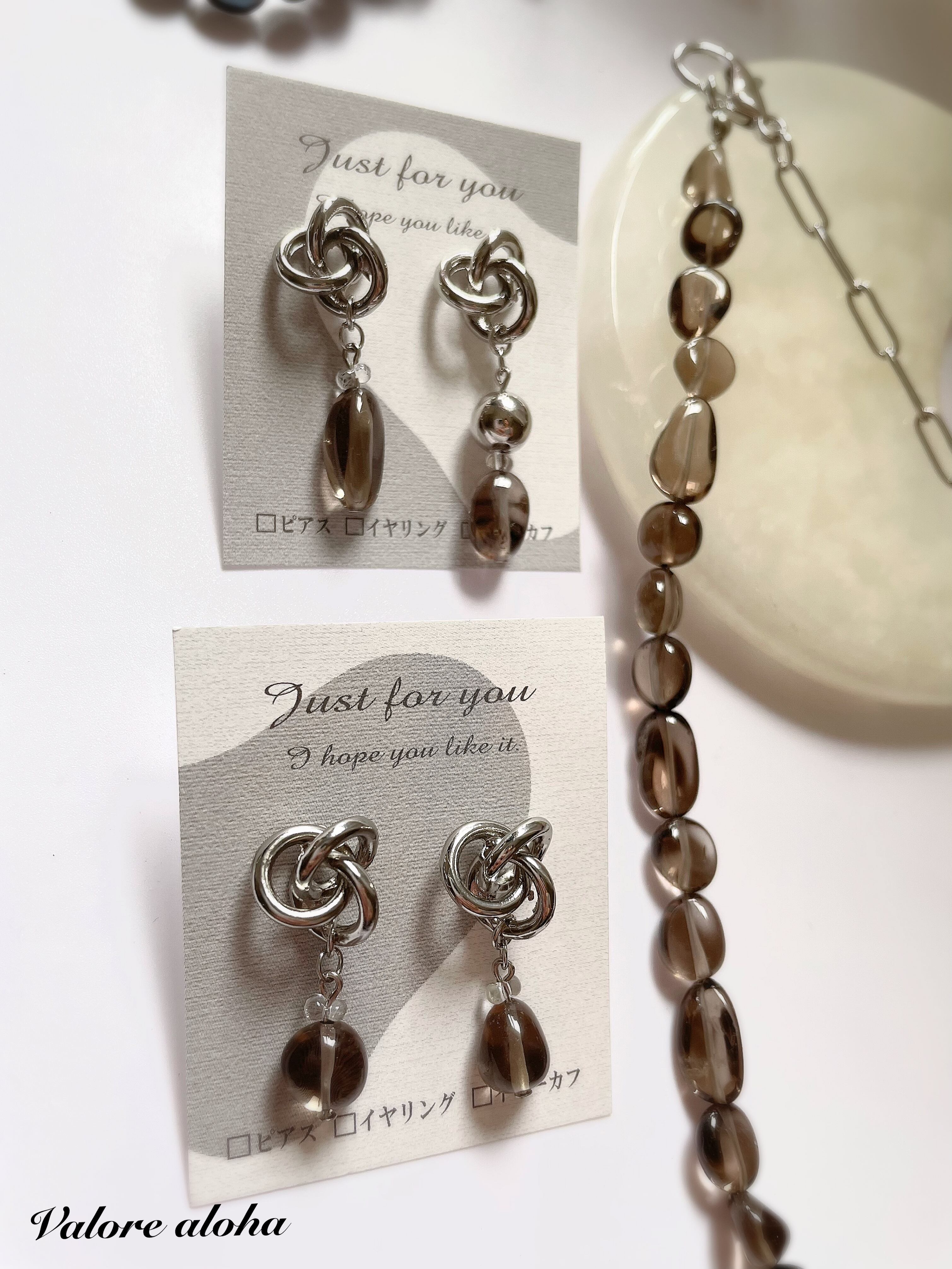 このセットは、美しいスモーキークォーツの輝きに加え、シンプルなデザインとなっています。