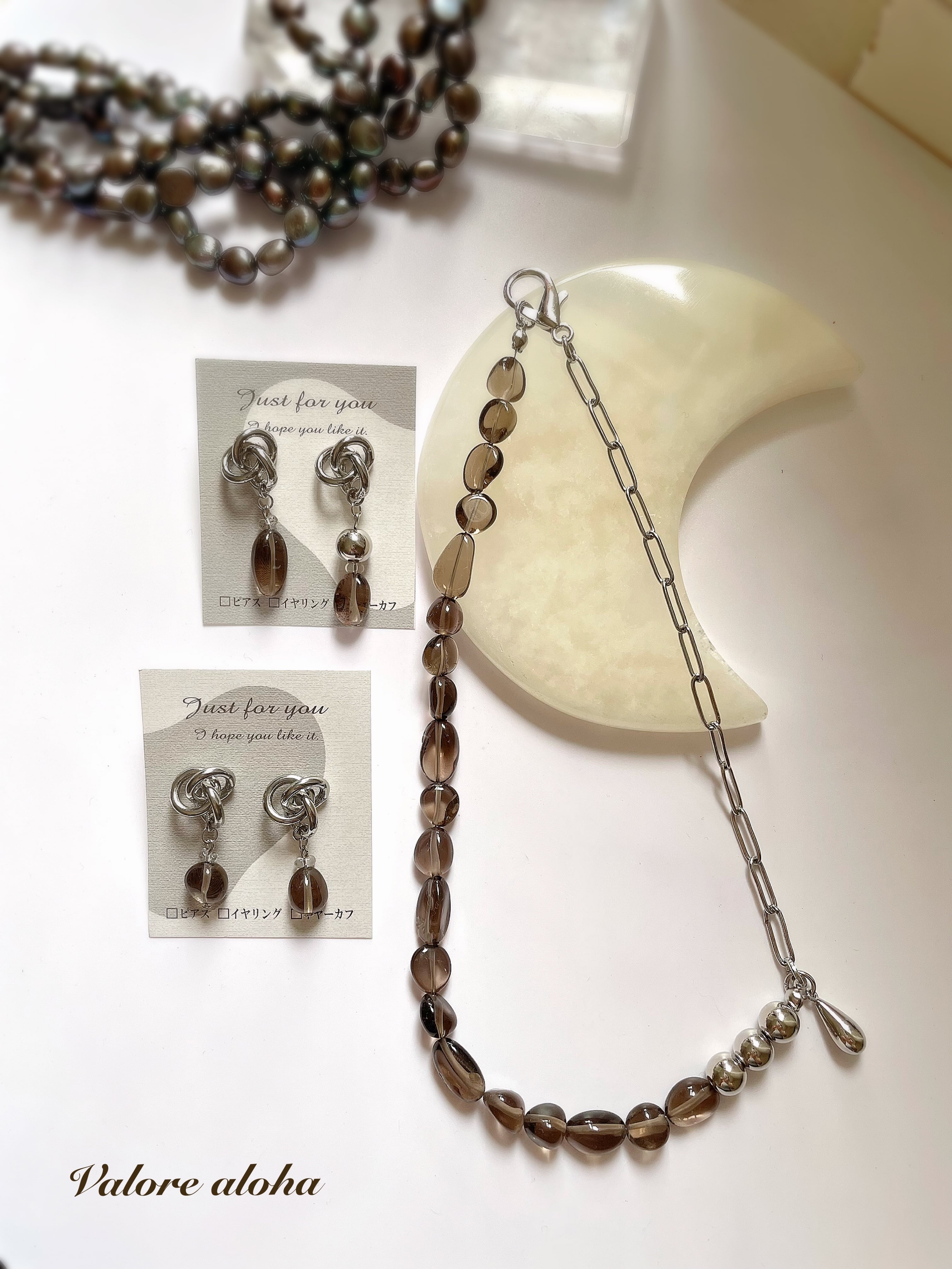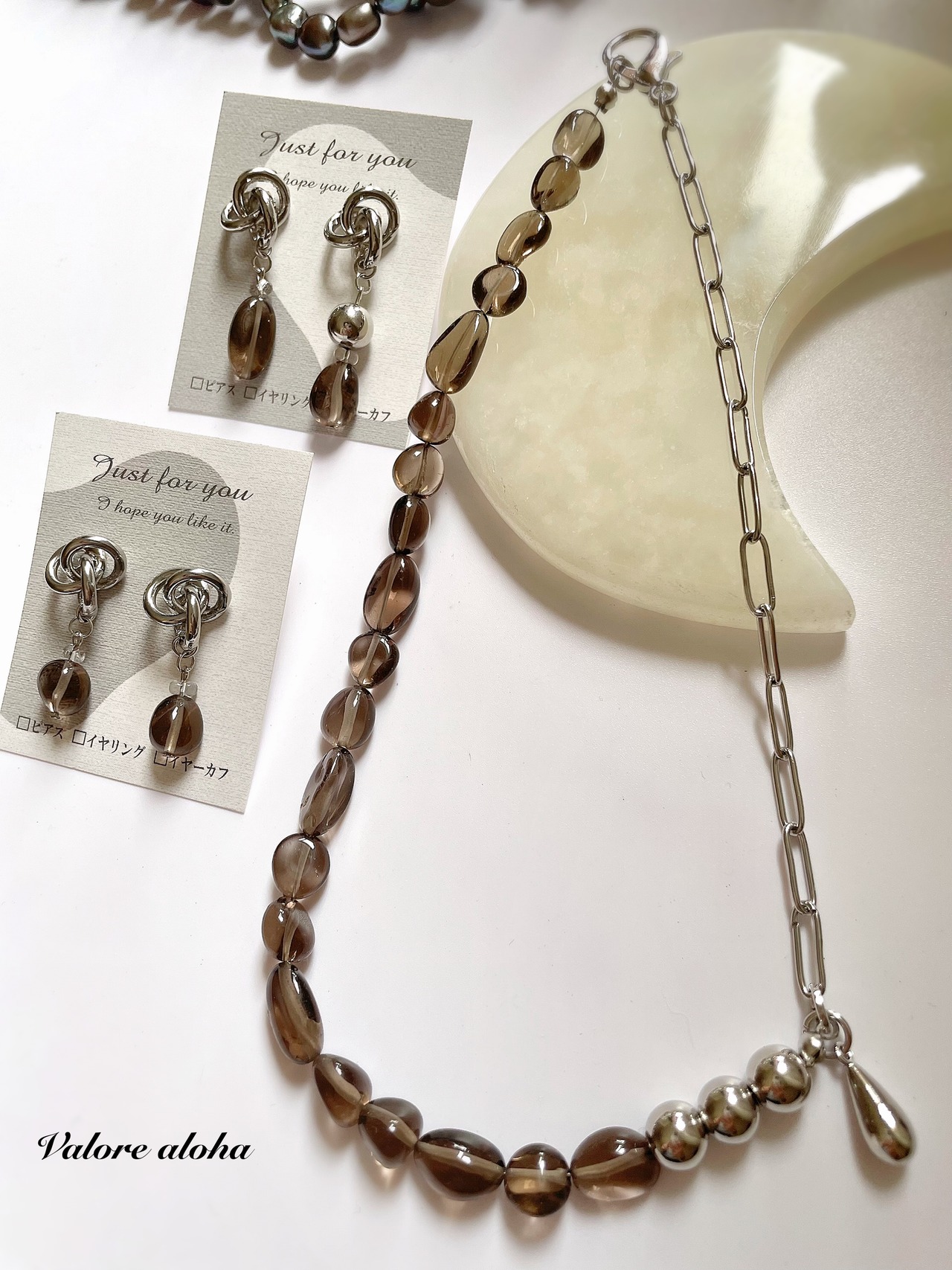 # スモーキークォーツとステンレスチェーンネックレス ピアスセット