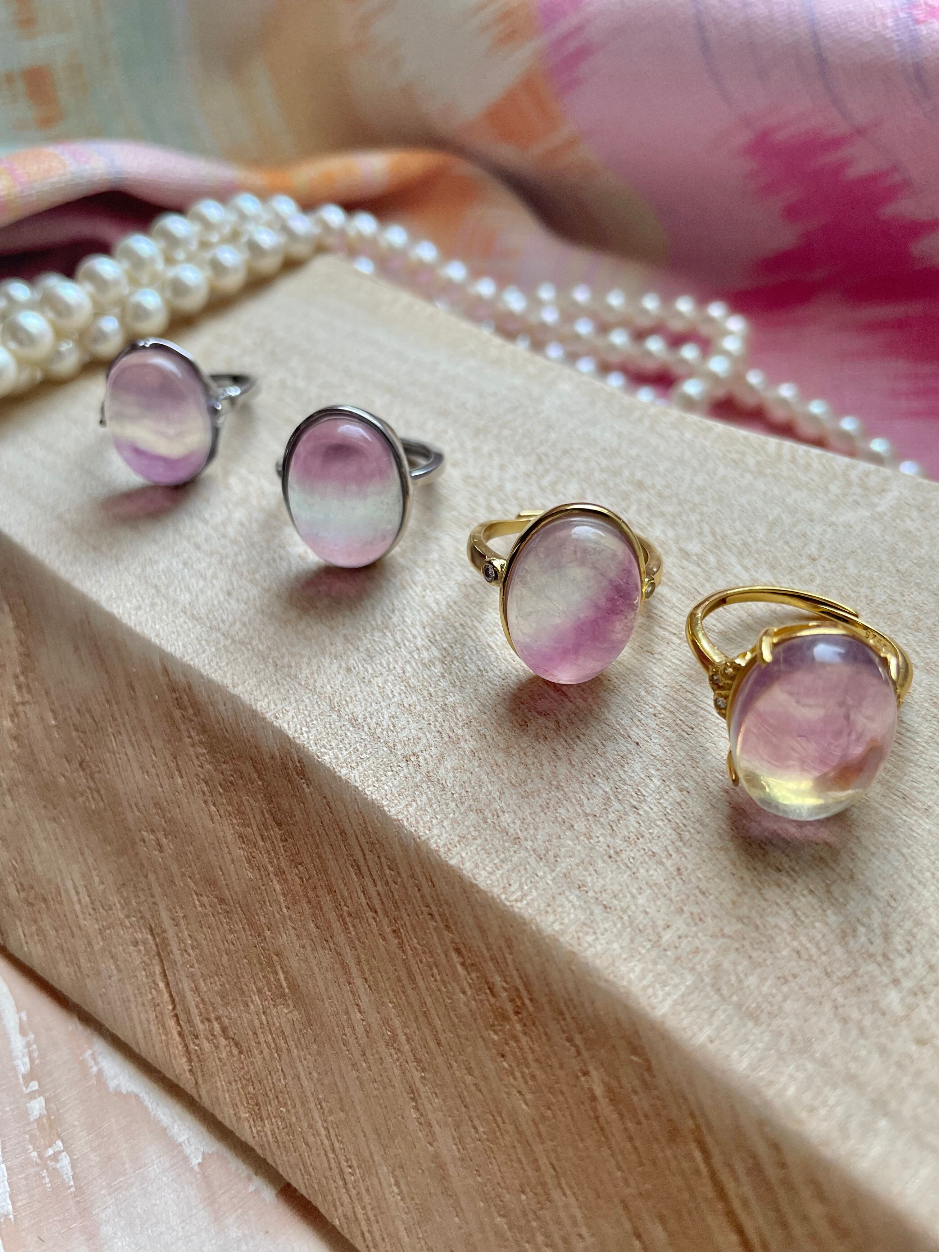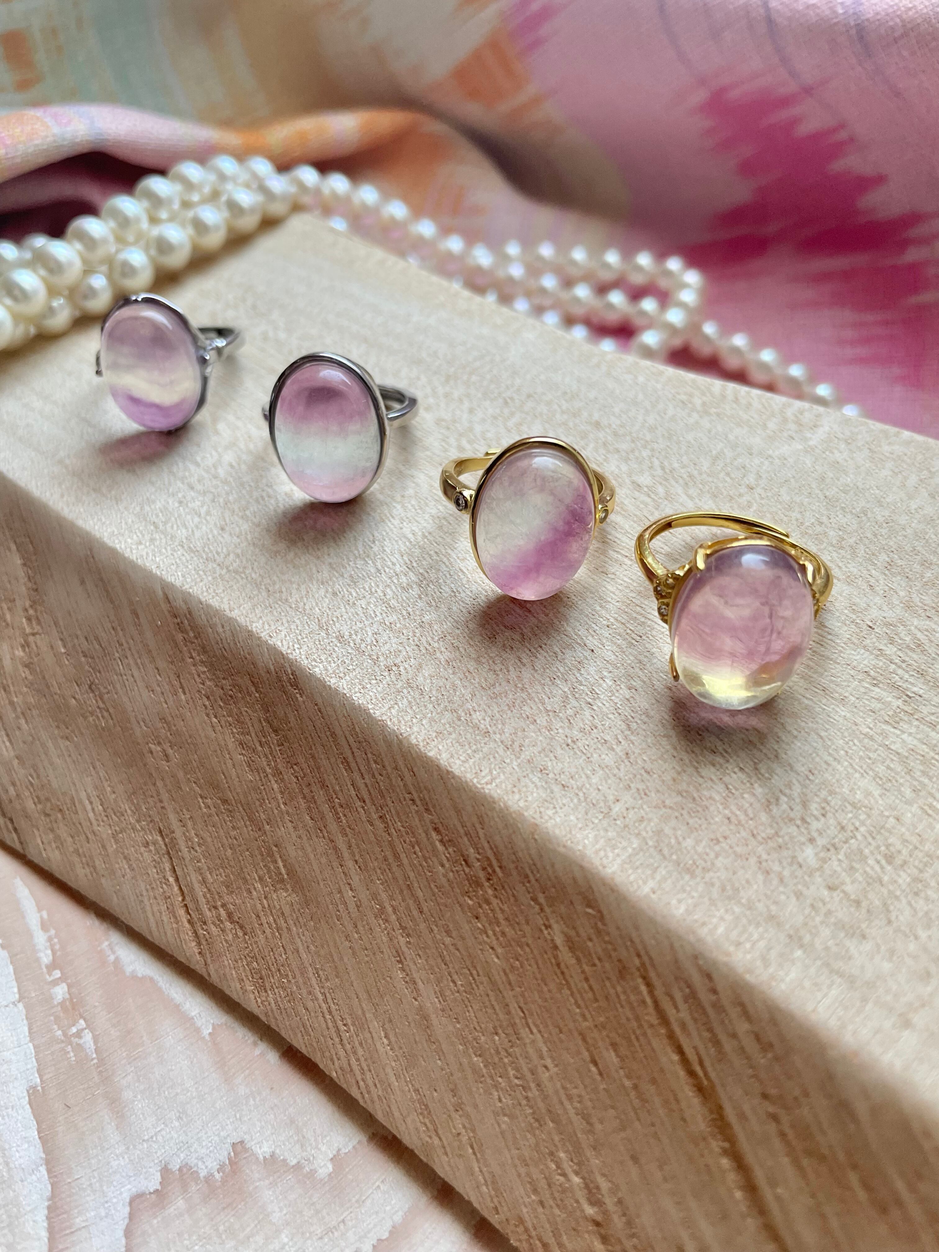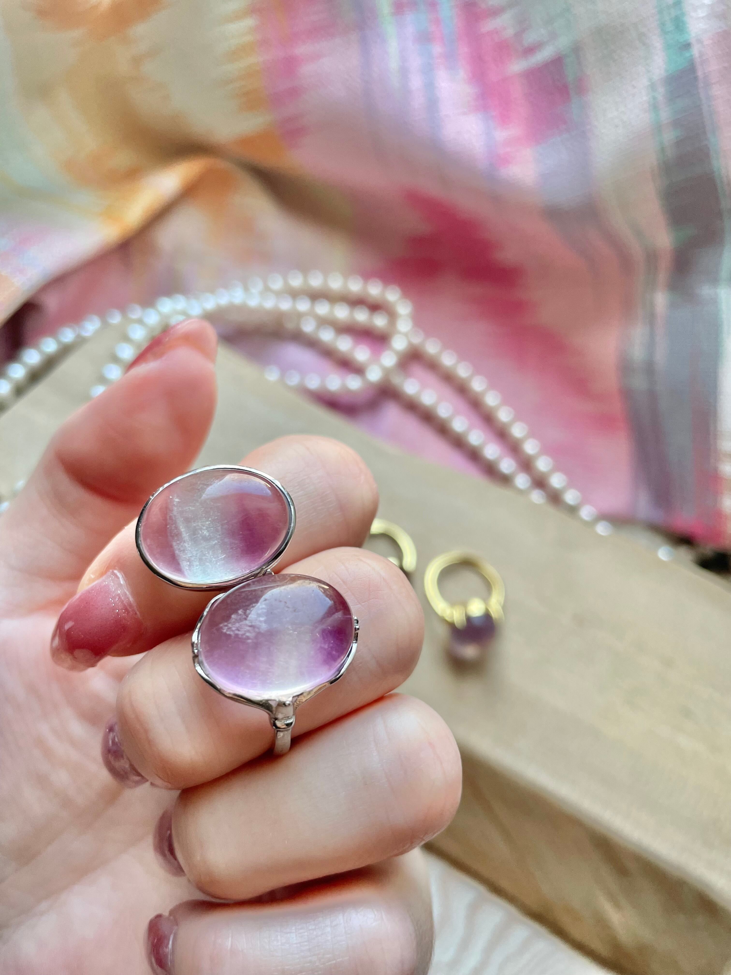 各リングはそれぞれ異なる色合いと模様を持っており、指元を彩る特別なアイテムとしてぴったりです。フローライトのユニークな輝きは、身に着ける人の個性を引き立ててくれることでしょう。